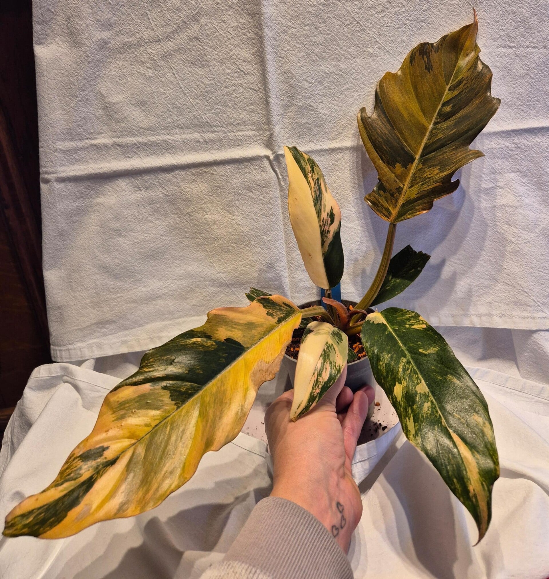 Der Philodendron Caramel Marble ist eine außergewöhnlich schöne Varietät mit spektakulärer Panaschierung in Cremeweiß, Gelb, Hellgrün und Karamelltönen. Jede Pflanze ist ein echtes Einzelstück – kein Blatt gleicht dem anderen.